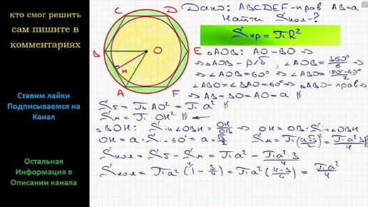 Математика В правильный шестиугольник, сторона которого равна a, писана окружность, и около него же описана окружность. Определить площадь