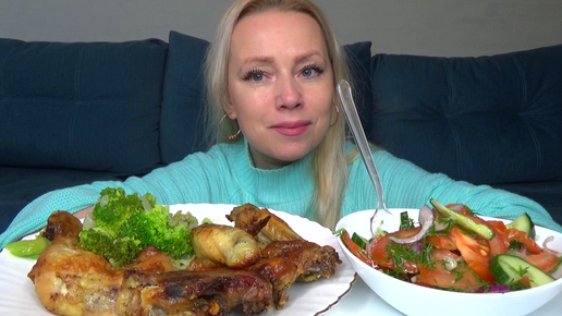 Курица запеченная в духовке и брокколи. Салат овощной. Мукбанг.