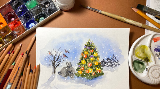 Символ 2023 года. Рисуем елочку, кролика и снегирей на дереве #рисуемкаждыйдень #рисуемакварелью #рисуемпоэтапно #рисуемвместе