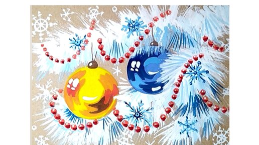 🟡🎀🔵Два стеклянных шара на ветке. Новогодняя открытка.🟡🎀🔵