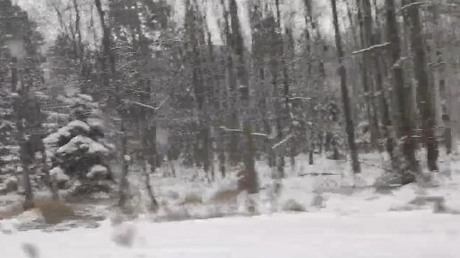 Заснеженный лес из окна автомобиля