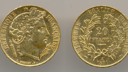 Нумизматика. Золотая монета. Франция, 20 франков 1851 года. Choice Uncirculated.