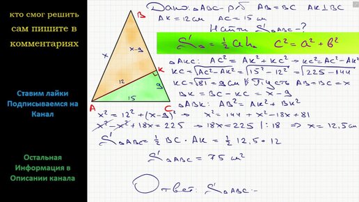 Математика Вычислить площадь равнобедренного треугольника, если длина высоты, проведенная к боковой стороне, равна 12 см, а длина основания