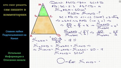 Математика Вычислить площадь трапеции ABCD (ADIIBC), если длины ее оснований относятся как 5:3 и площадь треугольника ADM равна 50 см2, где
