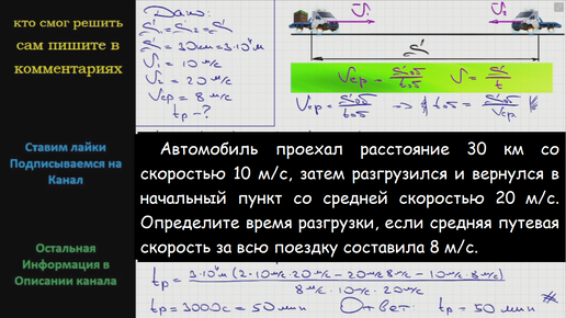 Физика Автомобиль проехал расстояние 30 км со скоростью 10 м/с, затем разгрузился и вернулся в начальный пункт со средней скоростью 20 м/с