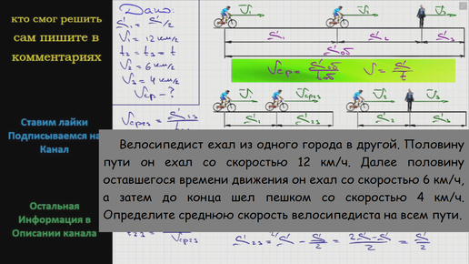 Физика Велосипедист ехал из одного города в другой. Половину пути он ехал со скоростью 12 км/ч. Далее половину оставшегося времени движения