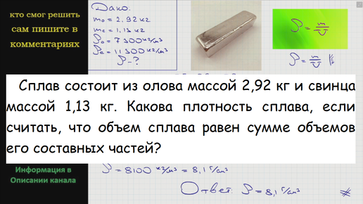 Физика Сплав состоит из олова массой 2,92 кг и свинца массой 1,13 кг. Какова плотность сплава, если считать, что объем сплава равен сумме