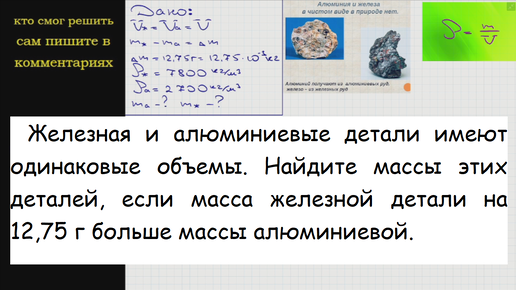 Физика Железная и алюминиевые детали имеют одинаковые объемы Найдите массы этих деталей, если масса железной детали на 12,75 г больше массы