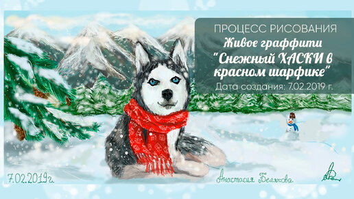 Арт "Снежный хаски в красном шарфике". Процесс рисования. 🤗🐕❄⛄❤