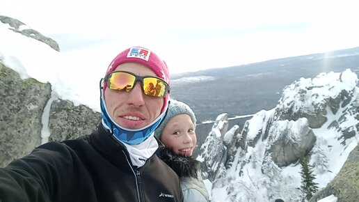 Вершина Двуглавой сопки. С погодой повезло, как никогда. Замечательный обзор, видно Златоуст. Очень скользко подниматься.