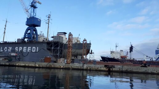 Плавучие доки в акватории Балтийского порта (Калининградская область). Вид с воды