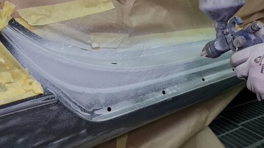 Подготовка грунтованного порога под покраску. Нанесение антигравия, готовый результат