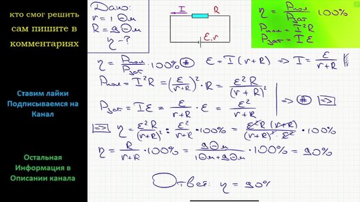 Физика К источнику тока, внутреннее сопротивление которого r = 1 Ом подключен резистор сопротивлением R = 9 Ом Найдите коэффициент полезного