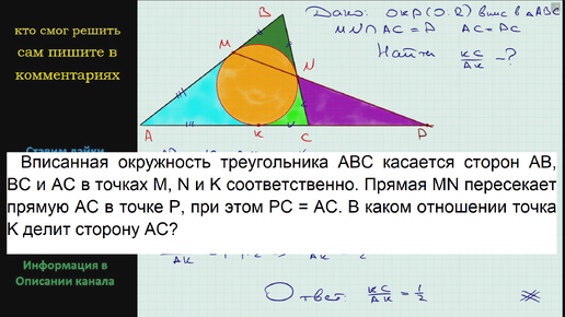 Геометрия Вписанная окружность треугольника ABC касается сторон AB, BC и AC в точках M, N и K соответственно Прямая MN пересекает прямую AC