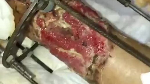 Установленный аппарат Илизарова после открытого перелома нижней конечности.
