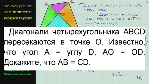 Геометрия Диагонали четырехугольника ABCD пересекаются в точке O. Известно, что угол A = углу D, AO = OD. Докажите, что AB = CD
