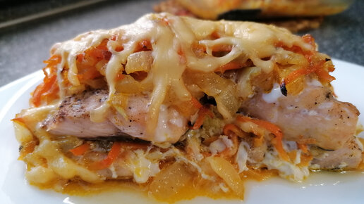 Рецепт вкусной и нежной горбуши под шубой из овощей и сыра.