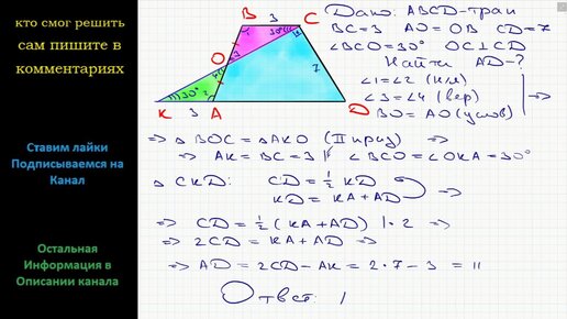 Геометрия Точка O – середина боковой стороны AB трапеции ABCD. Известно, что угол OCB равен 30, а угол OCD прямой. Найдите длину основания