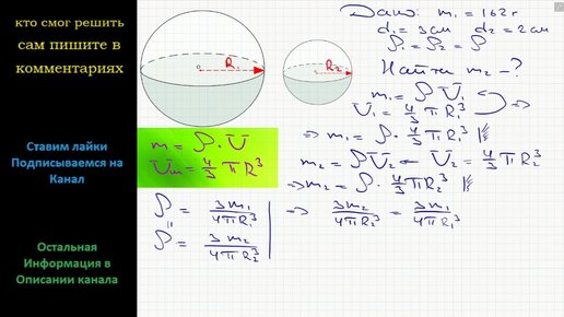 Геометрия Однородный шар диаметром 3 см имеет массу 162 грамма. Чему равна масса шара, изготовленного из того же материала, с диаметром 2 см