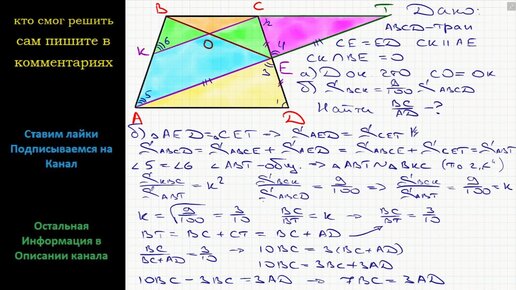 Геометрия Точка E — середина боковой стороны CD трапеции ABCD. На стороне AB взяли точку K, так, что прямые CK и AE параллельны. Отрезки CK