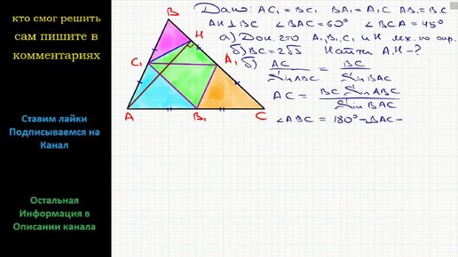 Геометрия В треугольнике ABC точки A1, B1 и C1 — середины сторон BC, AC и AB соответственно, AH высота, угол BAC = 60 угол BCA = 45 а)
