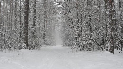 Снимите стресс с фоновыми звуками зимы. Шум ветра и падающего снега в заснеженном лесу, - идет снег на лесной дороге.