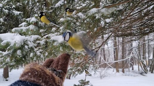 Налетай, желтопузики! Кормлю птичек с ладони