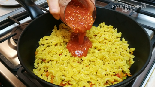 Просто к овощам добавляю макароны, заливаю томатным соком и готовлю 20 минут на сковороде (ну очень интересный и быстрый рецепт, делюсь)