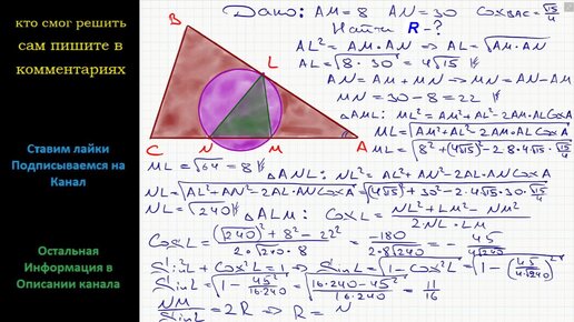 Геометрия Точки M и N лежат на стороне AC треугольника ABC на расстояниях соответственно 8 и 30 от вершины A. Найдите радиус окружности