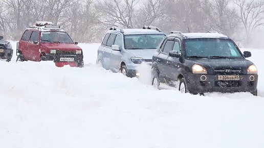 Машины попали в снежный плен. Джиперы спасают городские пузотёрки из сугробов. УАЗ, Нива, Ниссан, Субару на бездорожье.