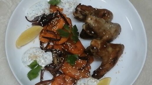 Куриные крылышки терияки с карамелизированной морковью и сметанным соусом