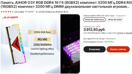 Память JUHOR ОЗУ RGB DDR4 16 Гб (8GBX2) комплект 3200 МГц DDR4 RGB (16GBX2) комплект 3200 МГц