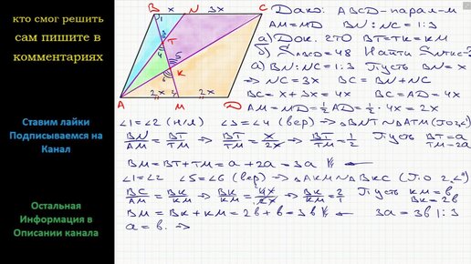 Геометрия На сторонах AD и BC параллелограмма ABCD взяты соответственно точки M и N, причём M середина AD, а BN : NC = 1 : 3 а) Докажите