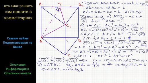 Геометрия Дана правильная треугольная призма ABCA1B1C1, у которой сторона основания равна 2, а боковое ребро равно 3. Через точки A, C1 и