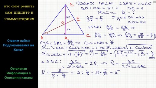 Геометрия В треугольнике ABC биссектриса угла A делит высоту, проведённую из вершины B, в отношении 5:4, считая от точки B. Найдите радиус