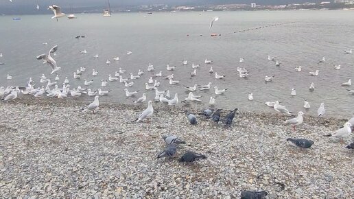 Забавные и голодные чайки на Чёрном море в облачный зимний день