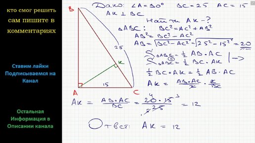 Геометрия Катет и гипотенуза прямоугольного треугольника равны 15 и 25. Найдите высоту, проведённую к гипотенузе.