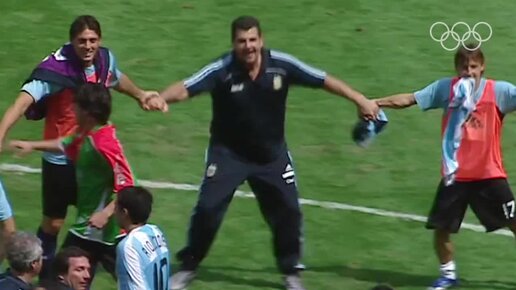 Сборная Аргентины по футболу празднует победу в финале Олимпийских игр
