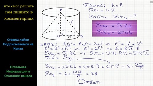 Геометрия Цилиндр и конус имеют общее основание и высоту. Высота цилиндра равна радиусу основания. Площадь боковой поверхности конуса равна