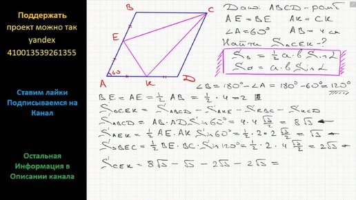 Геометрия Середины двух соседних сторон и не принадлежащая им вершина ромба соединены друг с другом отрезками прямых. Найдите площадь