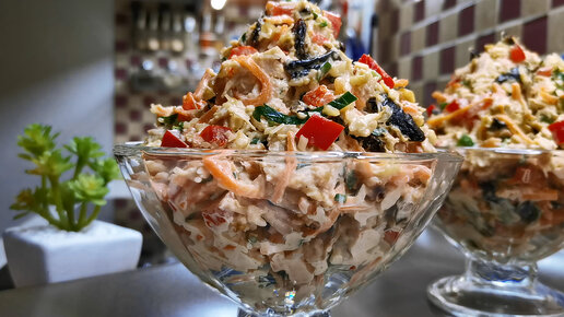 Салат "Лакомка", который всегда бьет рекорды восторженных отзывов от наших гостей. Рецепт для праздничного стола (с курицей и черносливом)