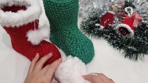 Вязаный новогодний сапожок - продолжение. Декор из меха.
