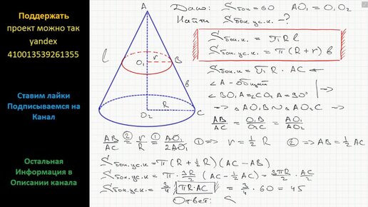 Геометрия Площадь боковой поверхности конуса равна 60. Параллельно основанию конуса проведено сечение, делящее высоту пополам. Найдите