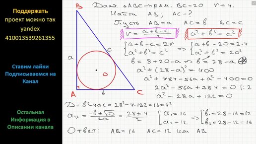 Геометрия Найдите катеты прямоугольного треугольника, если его гипотенуза равна 20, а радиус вписанной окружности равен 4