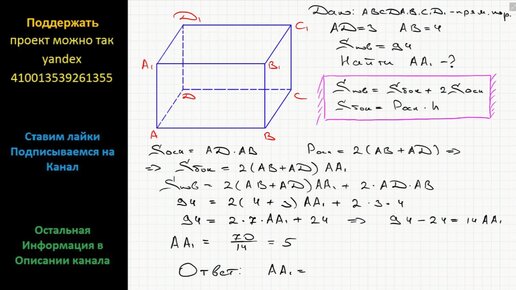 Геометрия Два ребра прямоугольного параллелепипеда, выходящие из одной вершины, равны 3 и 4. Площадь поверхности этого параллелепипеда