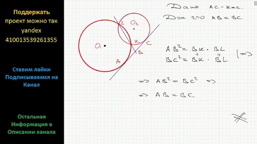 Геометрия Докажите, что прямая, проходящая через точки пересечения двух окружностей, делит пополам общую касательную к ним
