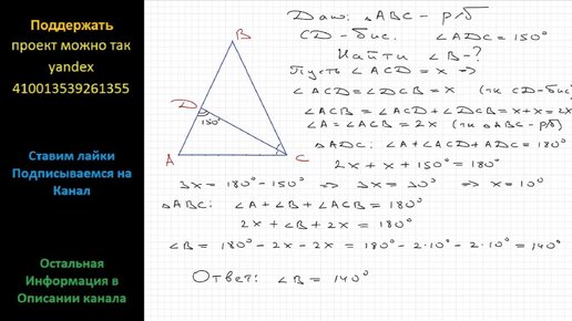 Геометрия ABC равнобедренный треугольник с основанием AC, CD биссектриса угла C, ∠ADC = 150°. Найдите ∠B.