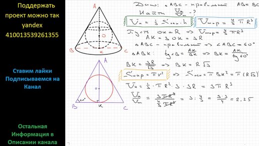 Геометрия В равносторонний конус (диаметр основания конуса равен длине его образующей) вписан шар. Найдите отношение объема конуса к объему