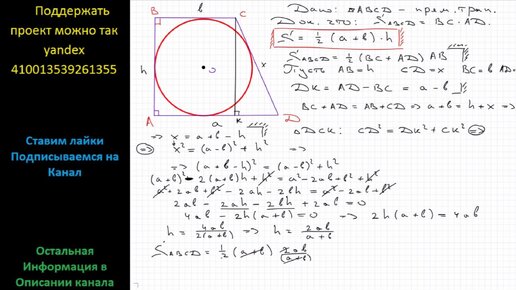 Геометрия Докажите, что площадь прямоугольной трапеции, описанной около окружности, равна произведению ее оснований