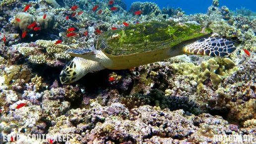 Египет. Гордая черепашка плывет среди красивых кораллов и рыб